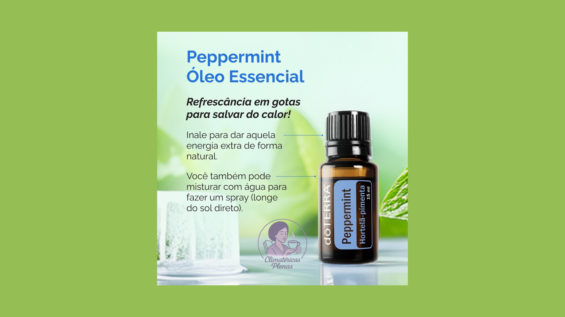 Refrescante, ajuda a aliviar as ondas de calor e a fadiga mental.